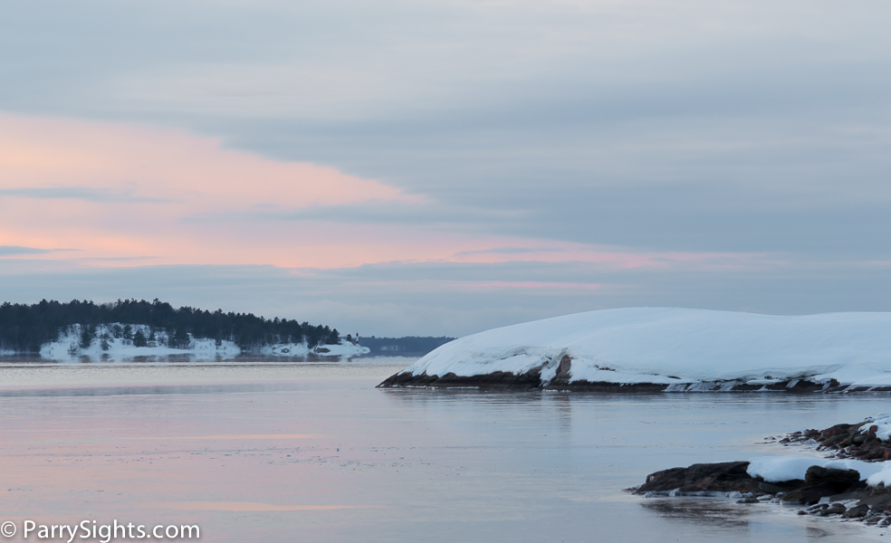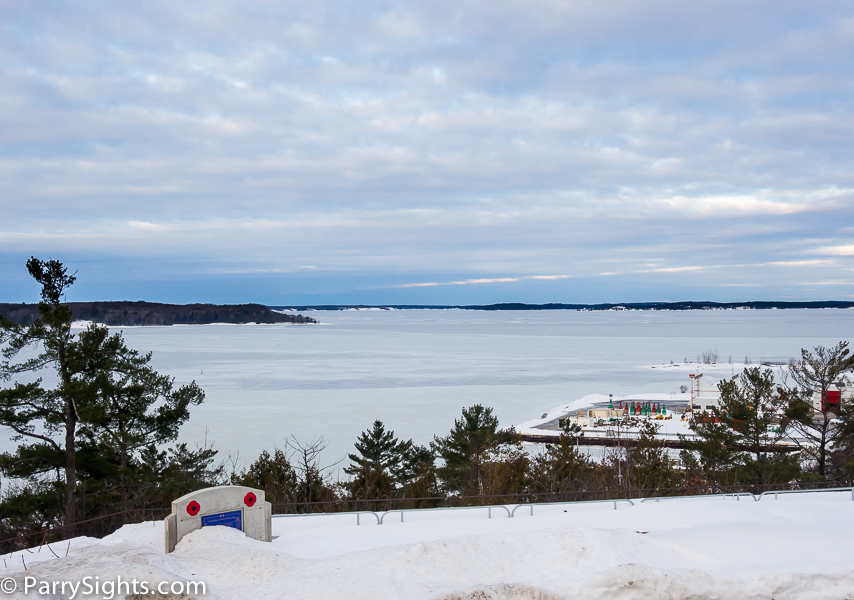 It’s that time of the year when we are able to walk on water. I’m able to confirm that the Big Sound is frozen over. In some places the ice is a bit ‘mushy’, while in others it’s ‘rock solid’ which is why it’s a good idea to head out on snowshoes So if you decide to wander out, take care. With the deep freeze forecast for the next few days the mushy spots should be solid by this time next week.