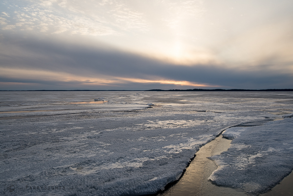 Not to be confused with the State of the Bay report (recommended reading) from the Georgian Bay Biosphere Reserve. As of yesterday evening, the Big Sound was icy white and thinning (much like my hair). The water is open from Parry Sound harbour to Three Mile Point in spots, but that’s about it. The photo below was taken yesterday evening from Monument Point on the North Shore Rugged Trail just north of Parry Sound looking west.