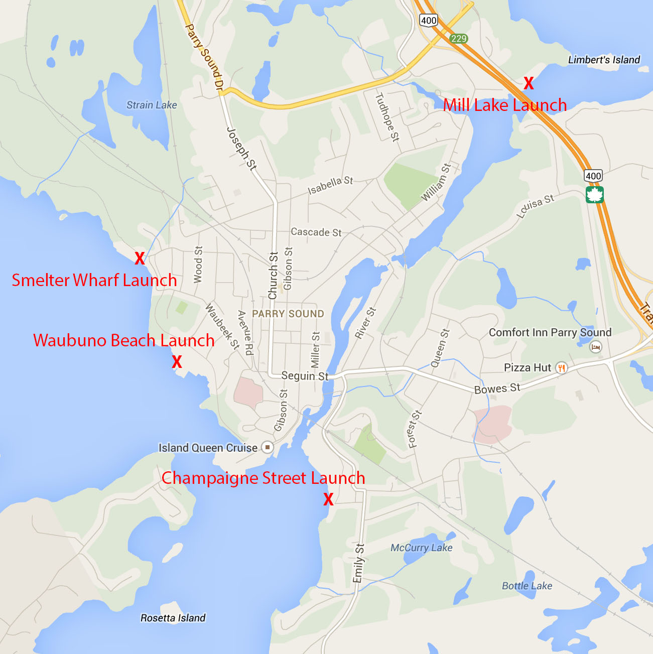 The Town of Parry Sound provices the public with four no-fee boat launches. Not only can the boat launches be use at no cost, there is no charge to park vehicles and trailers for a reasonable length of time. Three of these boat launches provide access to Georgian Bay, via Parry Sound Harbour or the Big Sound, the fourth provides access to Mill Lake.