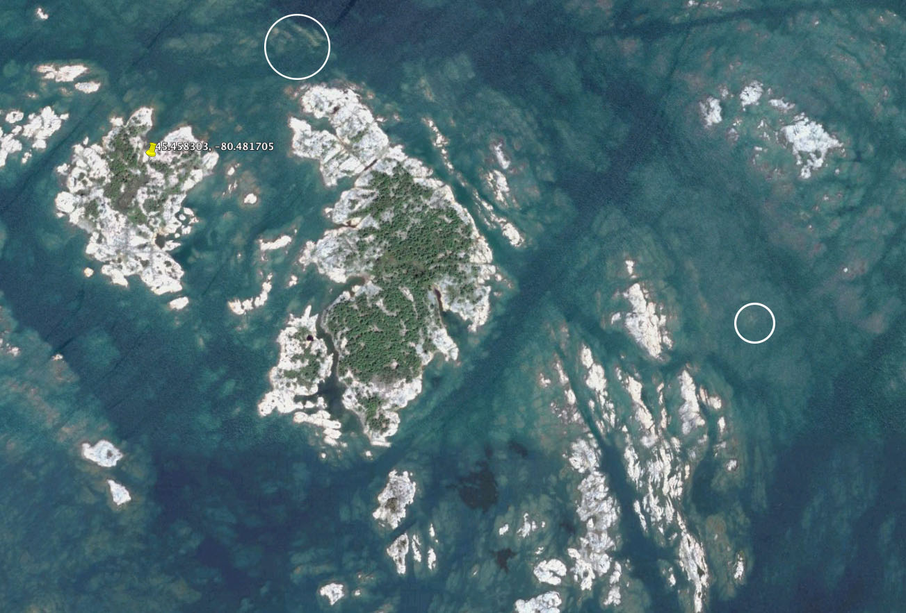 Looking closer (below), Google Earth can explain what I ‘discovered’ on my way in and out of Little McCoy. It’s pretty obvious that there is a seam in the channel that is consistent with the Navionics charts. But they are not perfect seams as you can see looking a little closer. I’ve tried to approximate the ‘ding points’ on the Google Earth projection and you can see what I discovered with the bottom of my outboard. What Navionics didn’t catch were the several shallow points in the area identified as 6-feet or deeper. No criticism of the app, they can’t be expected to have information on every square foot of Georgian Bay.