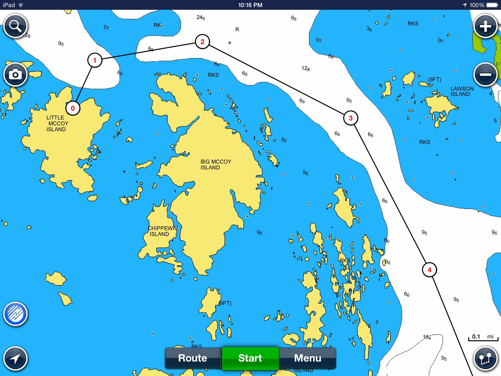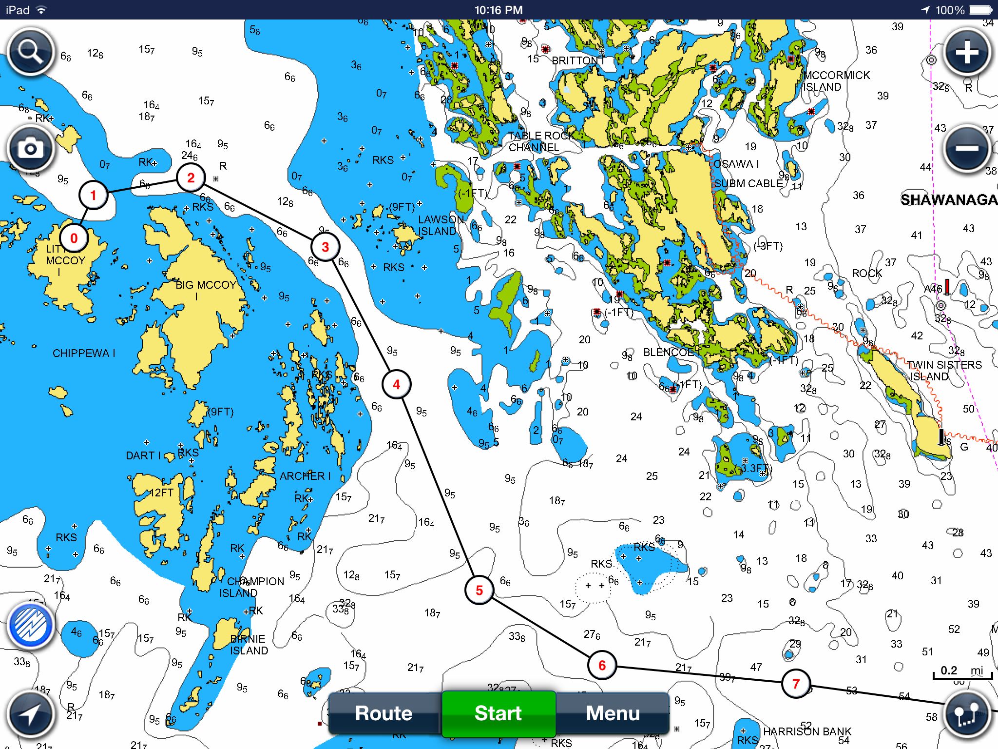 In a series of reviews last year I looked at how iPad apps from Navionics, iSailor and iNavX made it much easier to head off the small craft routes and explore some of the thirty thousand islands. Well these apps are great but they are not perfect as I found out last weekend on a trip from Parry Sound to Little McCoy Island (45.458303, -80.481705). This was a new destination for us and I spoke with couple of people about the best route to take as well as consulting with the Navionics and iSailor apps on my iPad. On route I was careful to ensure I stayed on my planned route using the Navionics app. Here’s a snapshot of the path once beyond the charted small craft route. The darker blue represents a depth of less than 6 feet while white represents depths of more than 6 feet. Boating with our 21-foot Scout and 150-hp Yamaha outboard I’m pretty comfortable with depths of 4-feet or more, and right now we are dealing with water levels at or slightly above chart datum.