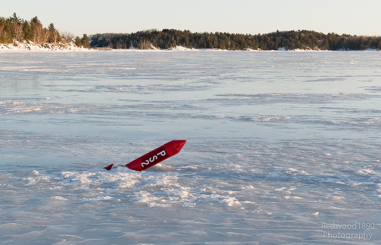 A familiar benchmark for the condition of the Big Sound, PS2 is now ‘bathed’ in ice rather than snow. We have had a few days a little above freezing followed by quite a bit more below freezing at night. Add in a little rain, not too much, and the Big Sound is turning into a skating rink. It’s been too cold to suggest there is much thinning of the ice, but the insulating layer of snow has been removed. It’s still weeks until boating season. The creeks and rivers are starting to open up so there will soon be some cold season kayaking possible.