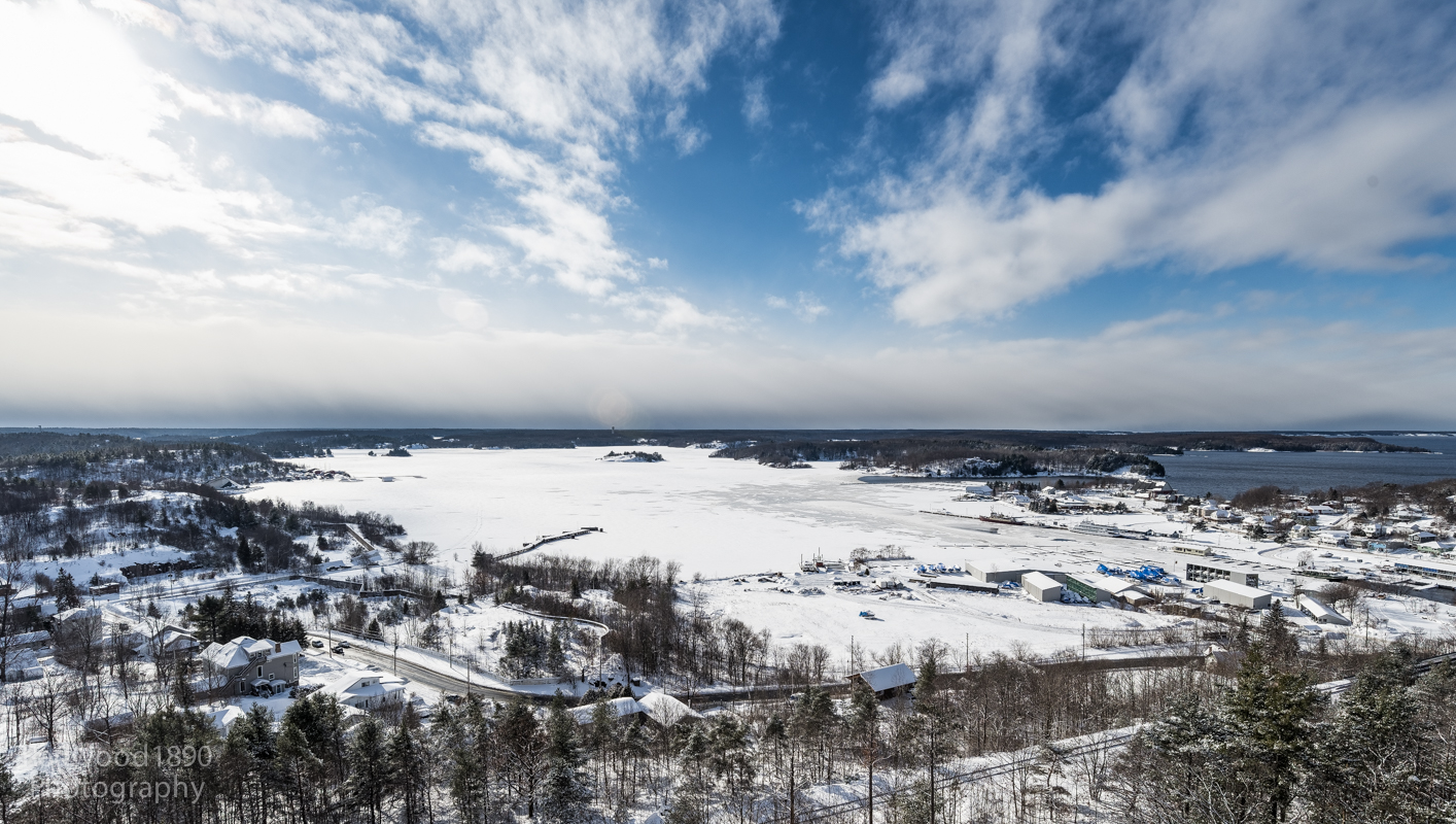 That’s Parry Sound Harbour. Remember yesterday’s photo of the Big Sound, wide open and with just a bit of ice on the far shore? Well here’s a photo taken the same day with Parry Sound Harbour to the left and the Big Sound to the right. Quite a contrast. Tucked in to the lower right you can see where the Seguin River flows into the harbour.