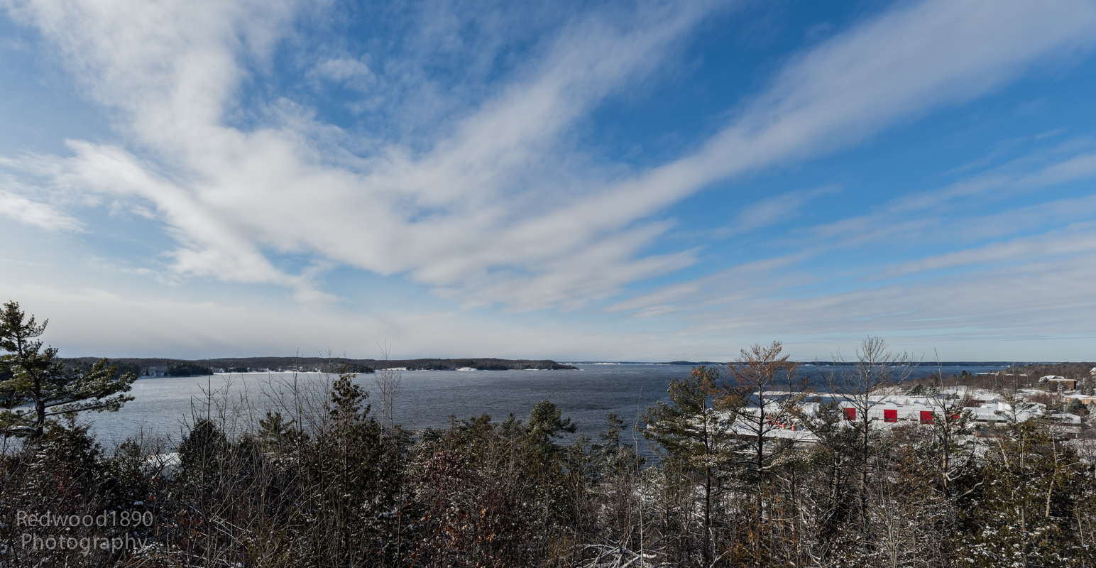 Here’s a simpler measure of water levels – a photograph of Zhiishib Rock in the Big Sound just outside Parry Sound harbour. Taken last week with calm conditions it suggests we are probably close to average in terms of water level. There doesn’t seem to be a high water mark, the topmost dark line, much above the current level, perhaps 20 centimeters (8 inches) or so. This may well represent the mean high water mark for the last few decades where there has been a fluctuation between alarming high and low water levels. (Click on the photo below for a larger version.)